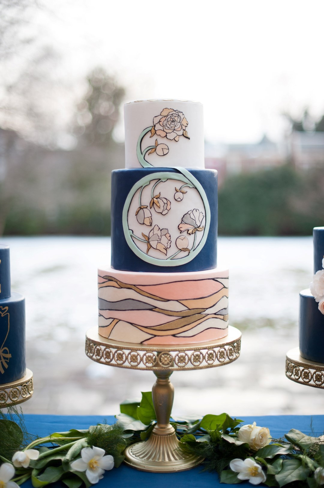 This was a trio of Art Nouveau cakes I designed at Sweet Fix bakery, for the Wedding Crashes Tour in Richmond, VA. I made the cakes by hand painting & cutting fondant, making gum paste and wafer paper flowers. Pictures by Jessica Maida.