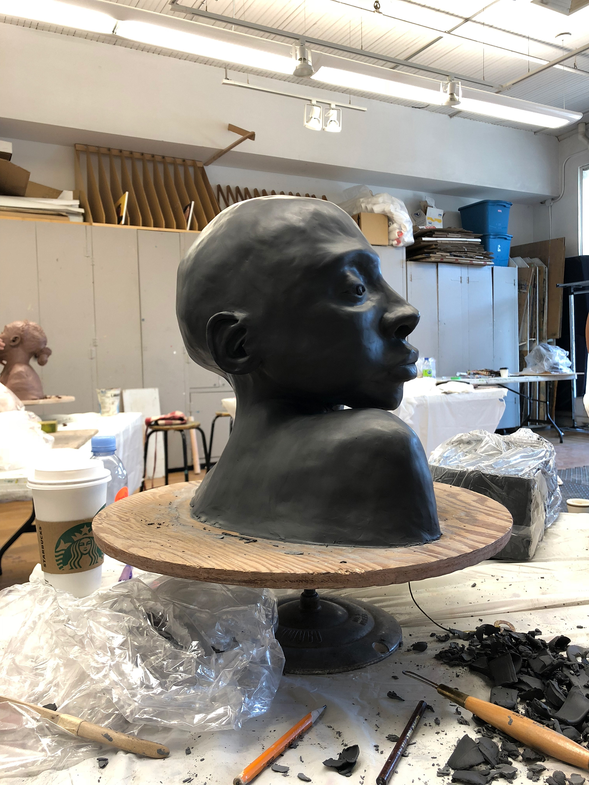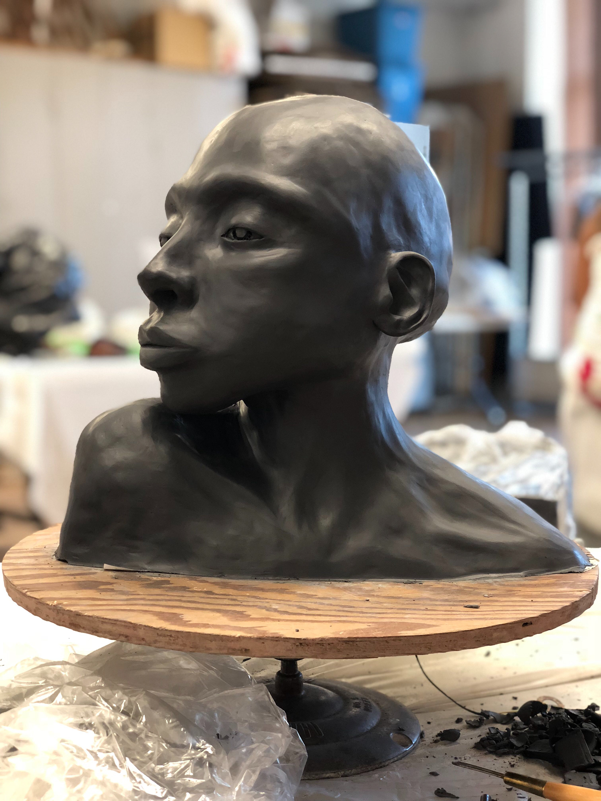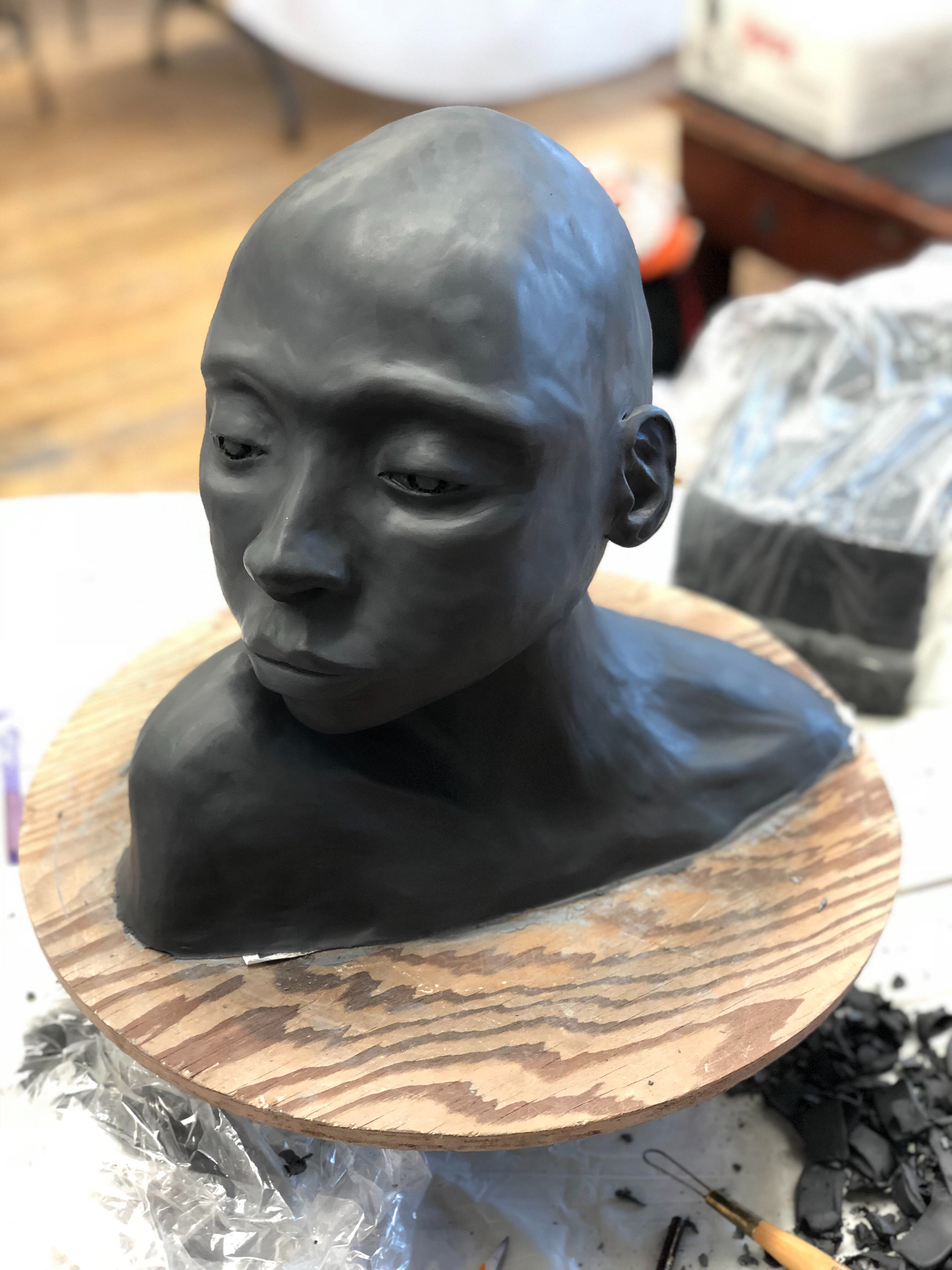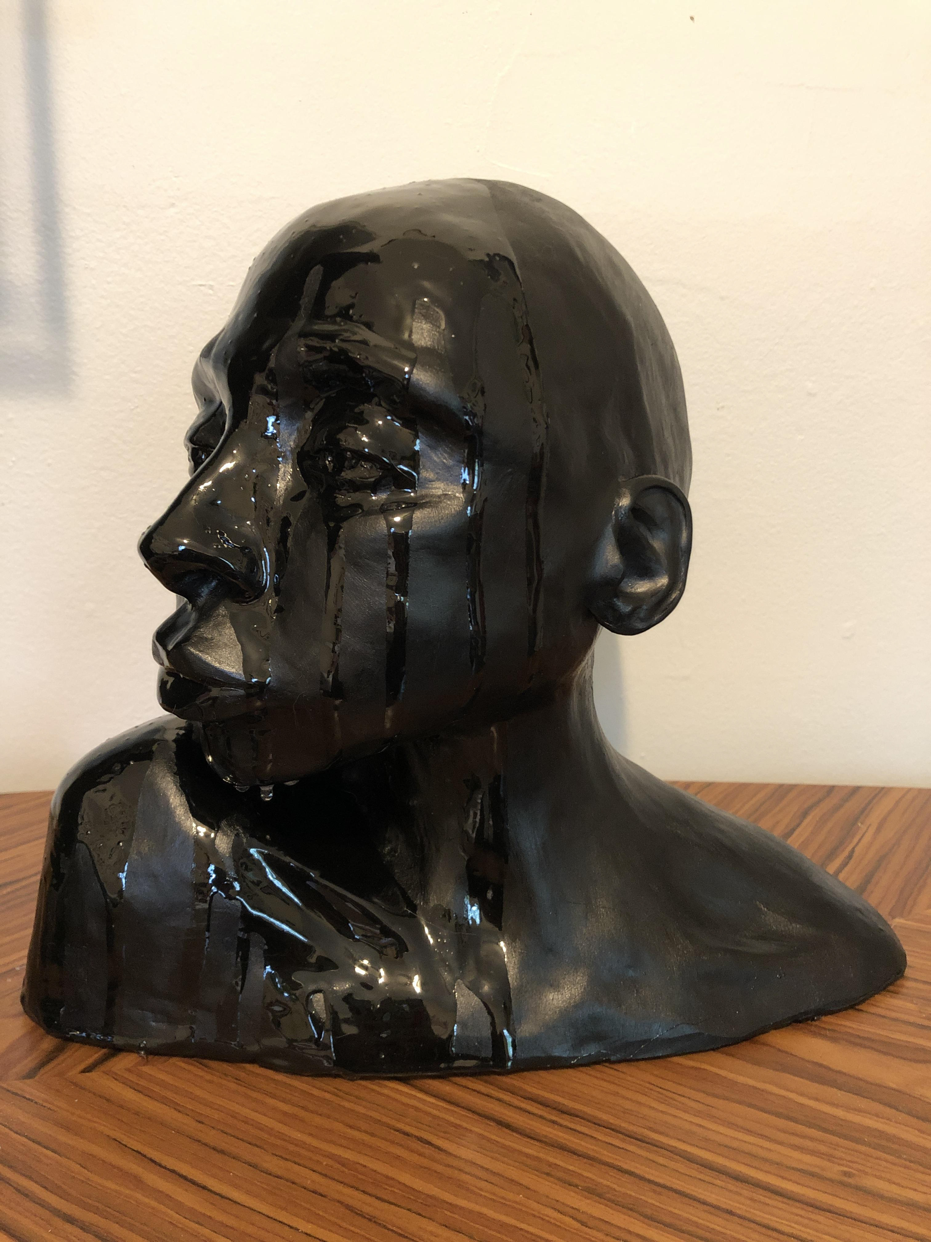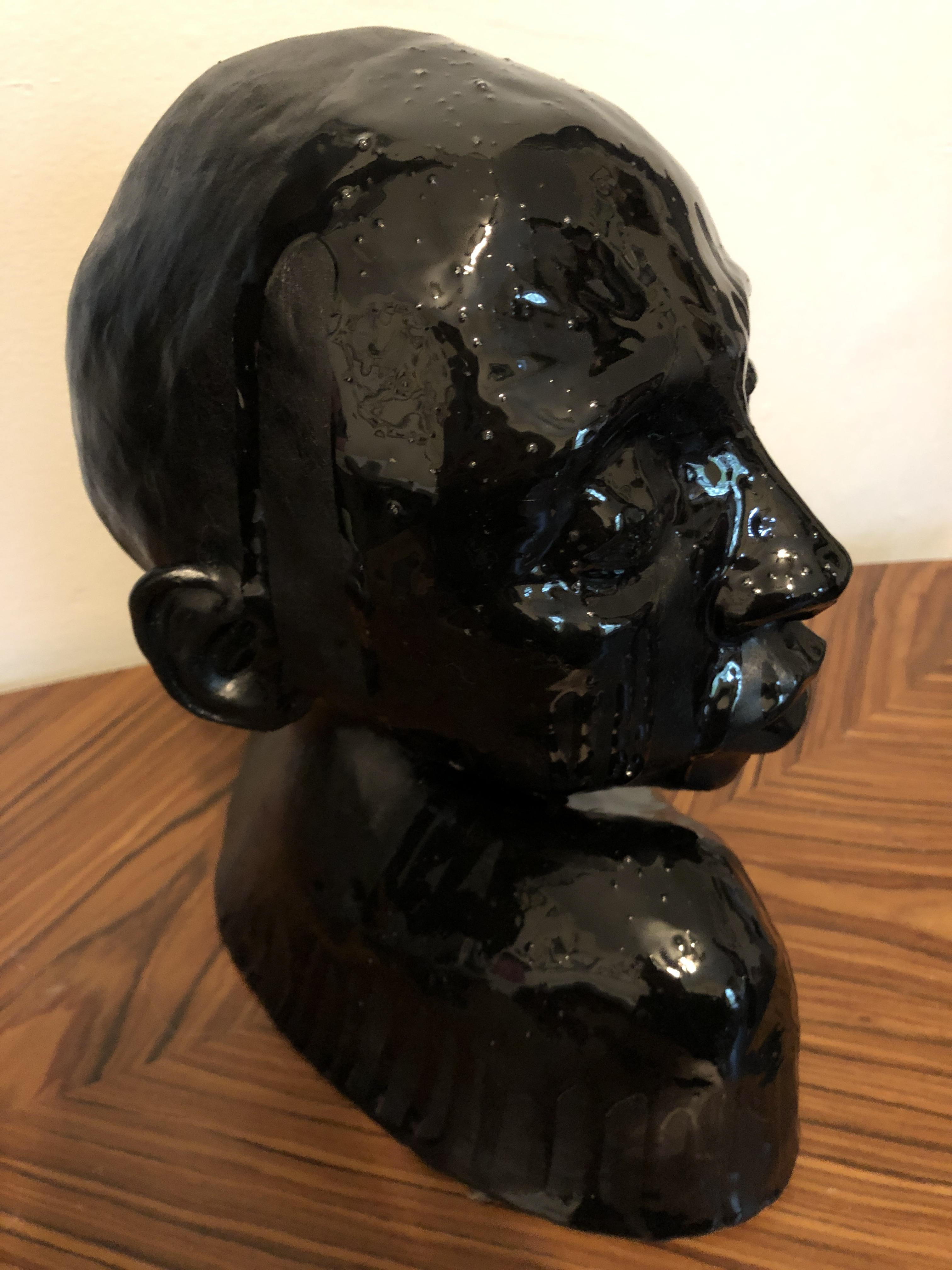 I went to a live model sculpture class, and made my first clay bust. After it was fired, I painted it black with acrylic, and poured resin over the face, mixing bubbles into it so the light would catch more, giving it more depth.