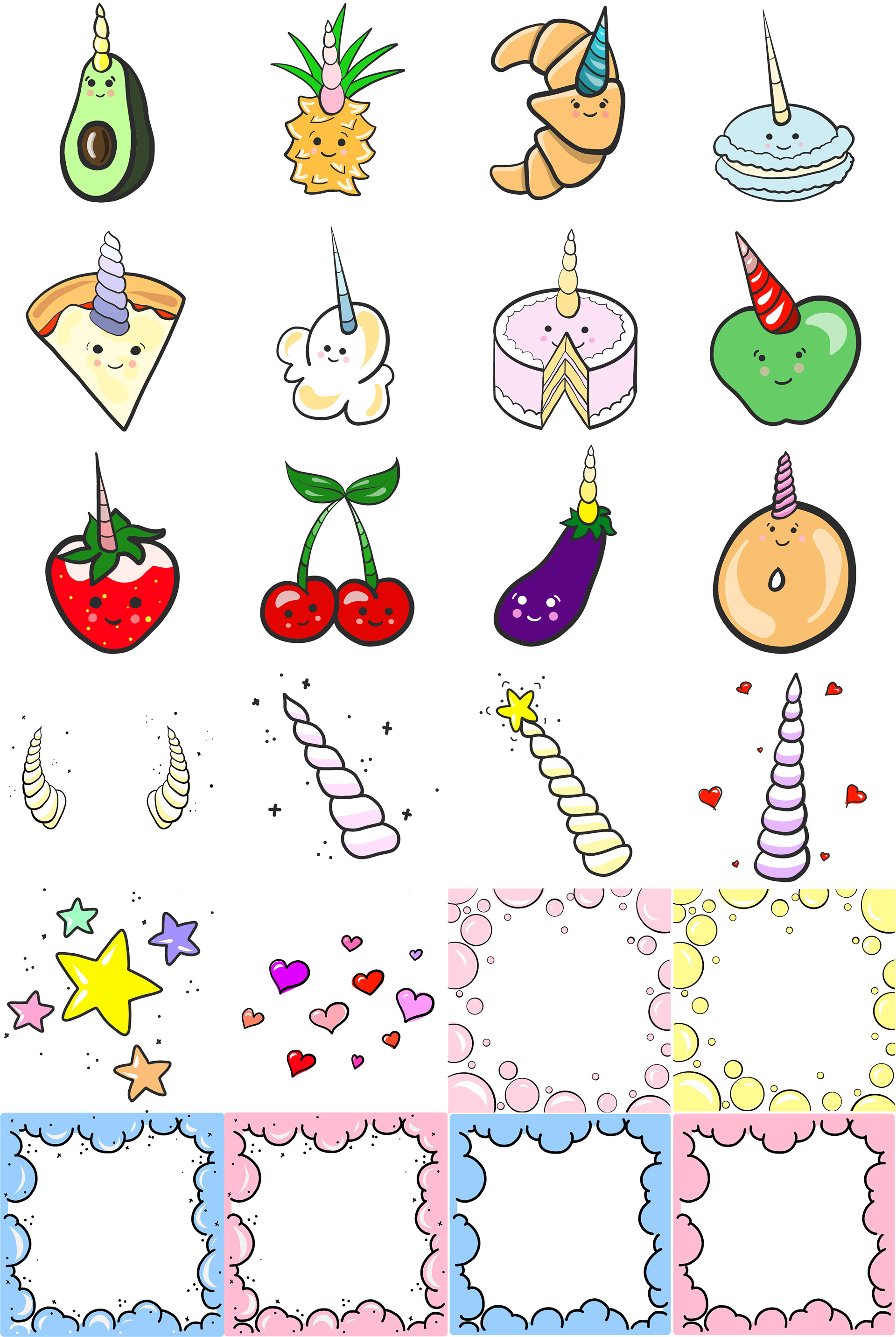 I was recruited by app sticker company PicCollage to design stickers for phone messages. Having always had a soft spot for anthropomorphized food, I decided to make unicorn foods with faces, along with accents and backgrounds.